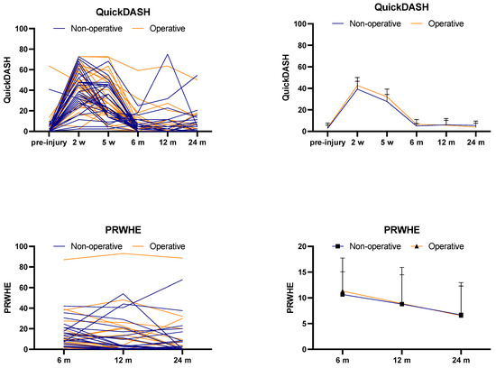 Likewise, PRWHE scores at 6 months, 1 year, and 2 years were dependent on time (p = 0.01) and participant (p < 0.001) but not treatment (p = 0.96) (Figure 3). The mean Quick-DASH and PRWHE scores are presented in Table 3. Pain was also not treatment-dependent (p = 0.43), but it was time-dependent (Table 3). Likewise, ROM was not treatment-dependent, and the combined active movements, namely flexion–extension, ulnar–radial deviation, and supination–pronation, were all solely time-dependent. Combined flexion–extension ROM in the non-operative group vs. the operative group had a median of 105 (35–170) and 110 (45–170) degrees at the latest follow-up (p > 0.05). ROM in the other directions was also similar between groups; i.e., median combined pronation–supination scores of 180 (125–180) vs. 180 (135–180) and median combined deviation scores of 65 (35–75) vs. 55 (30–75) degrees (p > 0.05).