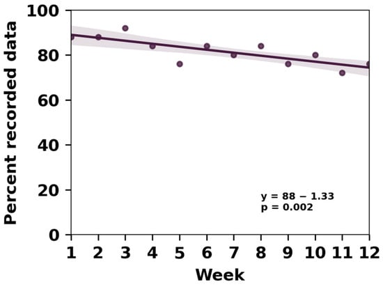 Eight patients completed the task every week, submitting 12 videos each that included 36 vTUGs. Eleven additional patients also completed the 12-week period but missed some weekly video recordings due to unspecified issues (Figure 1). Over the course of the study, we observed only a small attrition rate, with the percentage of available data decreasing from 88% in week 1 to 76% in week 12. Linear regression analysis estimated a 1.3% decrease in available data per week.