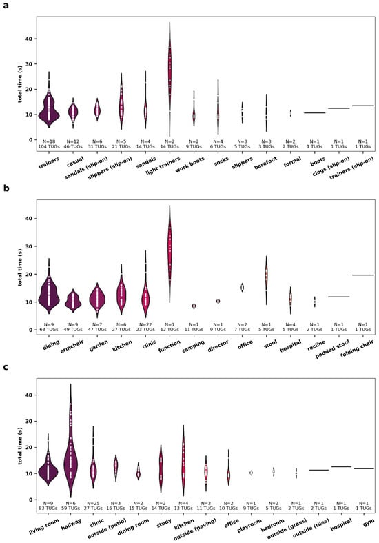Different shoes, chairs, and locations introduce notable variability in vTUG total time. Violin plots display the distribution of vTUG total time by the shoes worn (a), chairs used (b), and locations filmed at (c). The number of patients per category (N) and the total number of TUGs performed are indicated for each category.