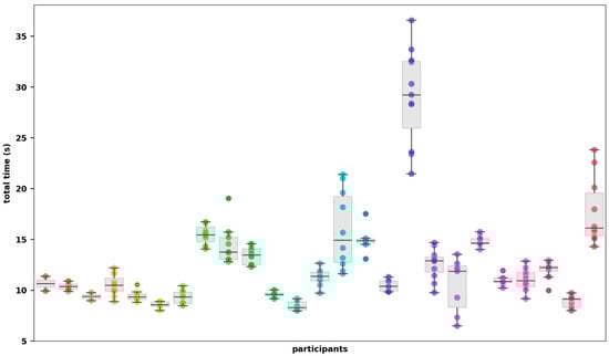 vTUG total time displayed for all participants. Different colours represent individual participants.