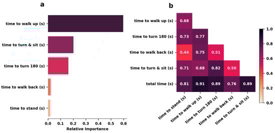 Time to walk up has the highest impact on vTUG total time. (a) Relative importance of vTUG segments for predicting vTUG total time. (b) Pearson correlations of vTUG segments and vTUG total time.