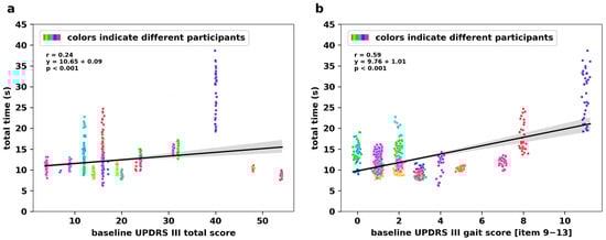 Correlation with MDS UPDRS III gait score indicates vTUG’s ability to detect gait impairments in people with PD. Regression plots for vTUG total time against baseline MDS UPDRS III total score (a) and gait subscore derived from the sum of UPDRS III items 9–13 (b).