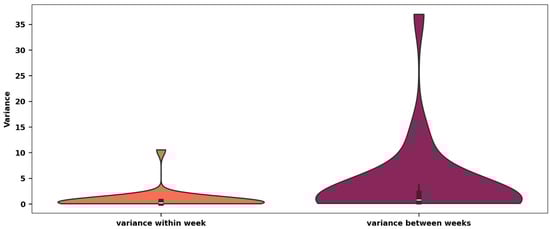 The variance of the total time within the three vTUGs performed consecutively in one week was on average 0.87 s2 (SD = 3.19), ranging from 0.01 to 38.6 s2. In contrast, the variance of the weekly vTUG means over the course of the 12 weeks of the study was on average 12.55 s2 (SD = 4.66), ranging from 6.47 to 36.55 s2 (Figure 6). To assess whether there were significant differences between these variances, an F-test was conducted, yielding an F-statistic of 6.50 (p < 0.001) and indicating that the variance between weeks was significantly larger than the variance within one measuring time point.