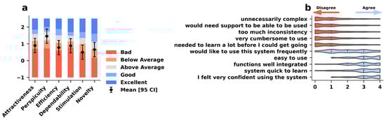 The UEQ is a standardized questionnaire designed to assess the user experience of products, systems, or services. It consists of 26 items that measure six key dimensions: Attractiveness, Perspicuity (clarity), Efficiency, Dependability, Stimulation, and Novelty. Participants rate each item on a seven-point scale ranging from −3 (extremely bad) to +3 (extremely good). Instead of generating an overall score, mean values for each domain are analyzed, with values greater than 0.8 considered a positive evaluation [27].