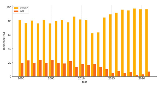 Table 2. The incidence of urethral stricture was consistently higher for mTURP compared to OSP throughout the period. The difference in stricture rates between the two procedures became more pronounced in recent years, with mTURP having a significantly higher rate of strictures, particularly after 2015 (