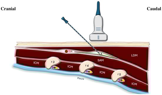 Illustration of the ultrasound-guided superficial serratus anterior plane block. The ultrasound probe is positioned to visualize the latissimus dorsi and serratus anterior muscle. A needle is inserted in-plane toward the fascial plane between these two muscles, and local anesthetic is administered. The thoracodorsal artery serves as a key anatomical landmark for correct placement. The intercostal neurovascular bundles are located just inferior to each rib. LDM: latissimus dorsi muscle; SAM: serratus anterior muscle; LA: local anesthetic; TDA: thoracodorsal artery; ICM: intercostal muscle; r3: third rib; r4: fourth rib; r5: fifth rib.