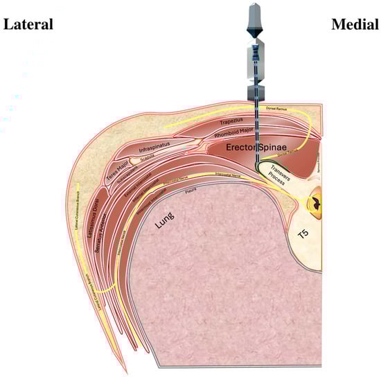 - Versyck, B. Pectoral and Serratus Plane Blocks. In Regional Nerve Blocks in Anesthesia and Pain Therapy: Imaging-Guided and Traditional Techniques, 5th ed.; Jankovic, D., Peng, P., Eds.; Springer International Publishing: Berlin/Heidelberg, Germany, 2022; pp. 445–454. [Google Scholar]