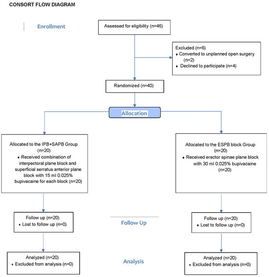 A total of 46 patients were screened for eligibility, of whom six were excluded (two due to conversion to open surgery and four who declined participation). The remaining 40 patients were randomized equally to receive either ESPB (n = 20) or IPB + SAPB (n = 20) (Figure 4).