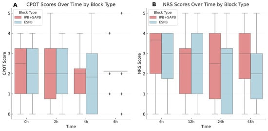 Changes in pain scores over time following minimally invasive cardiac surgery with ESPB and IPB + SAPB. (A) Box plots representing CPOT scores at 0, 2, 4, and 6 h postoperatively. A significant time effect was observed (p = 0.029), but no group or time × group interaction effect was found. Outlier values at the 6-h time point are represented by diamond symbols. (B) Box plots representing NRS scores at 6, 12, 24, and 48 h postoperatively, recorded during the postoperative period when patients were awake and extubated. No statistically significant differences were detected between the groups. ESPB: erector spinae plane block; IPB: interpectoral plane block; SAPB: superficial serratus anterior plane block; CPOT: critical-care pain observation tool; NRS: numeric rating scale.