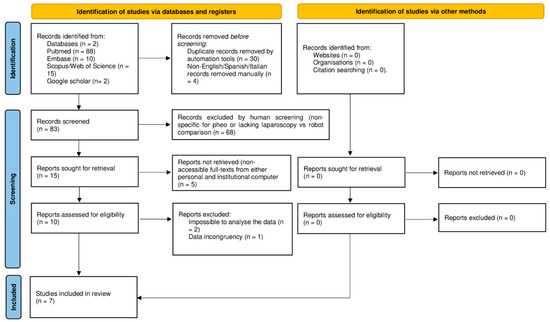 We conducted a systematic review of published articles between 2013 and 2025 according to the Preferred Reporting Items for Systematic Review and Meta-Analysis (PRISMA) statement [15] and according to the Cochrane Handbook for systematic reviews of interventions [16]. The review protocol was not registered. The search was conducted in MEDLINE (PubMed, Scholar, and Cochrane databases) [17] using the following string research: (Pheocromocitoma) AND (surgery), OR (adrenalectomy), OR (laparoscopy), OR (mini-invasive), OR (mininvasive), OR (robot).