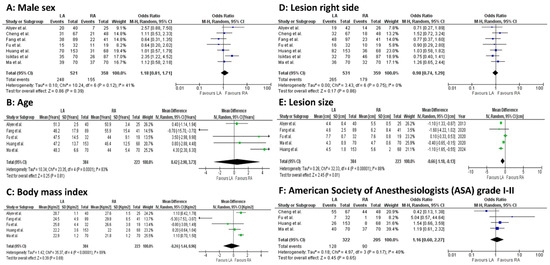 Meta-analysis of preoperative outcomes. (A): Male sex. (B): Age. (C): Body mass index. (D): Lesion right side. (E): Lesion size. (F): American Society of Anesthesiologists (ASA) grade I–II [23,24,25,26,27,28,29].