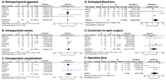 Meta-analysis of intraoperative outcomes. (A): Retroperitoneal approach. (B): Intraoperative events. (C): Intraoperative complications. (D): Estimated blood loss. (E): Conversion to open surgery. (F): Operative time [23,24,25,26,27,28,29].