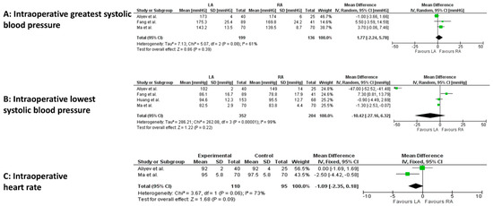Meta-analysis of intraoperative cardiovascular variables. (A): Intraoperative greatest systolic blood pressure. (B): Intraoperative lowest systolic blood pressure. (C): Intraoperative heart rate [23,24,26,29].