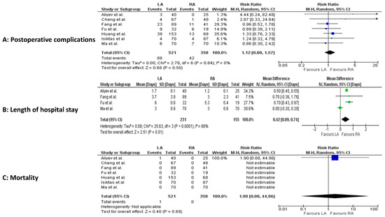 Meta-analysis of postoperative results. (A): Postoperative complications. (B): Postoperative length of hospital stay. (C): Postoperative mortality [23,24,25,26,27,28,29].