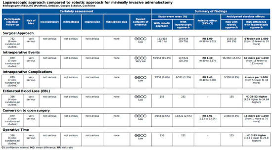 - Xia, Z.; Li, J.; Peng, L.; Yang, X.; Xu, Y.; Li, X.; Li, Y.; Zhang, Z.; Wu, J. Comparison of Perioperative Outcomes of Robotic-Assisted vs Laparoscopic Adrenalectomy for Pheochromocytoma: A Meta-Analysis. Front. Oncol. 2021, 11, 724287. [Google Scholar] [CrossRef] [PubMed]