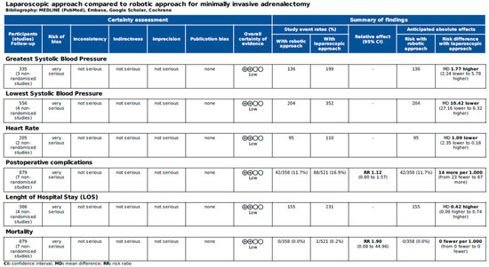 This systematic review and meta-analysis study has several limitations such as the small number of articles included and, as a consequence, the small number of patients for each group, which restricts the statistical power and generalizability of the findings. Furthermore, it is not possible to carry out a sub-analysis based on lesion side, BMI, and surgical approach which could add value to the analysis, due to data reported in the included studies. Moreover, the retrospective nature of most of the included studies introduces inherent biases such as selection and confounding, which have been acknowledged in our risk of bias assessment. The assessment of the risk of bias (Table 1) and the further GRADE assessment of the individual studies (Figure 6 and Figure 7) confirm what has been said. The high degree of heterogeneity observed in the meta-analysis complicates the pooling of results and the interpretation of outcomes, as well as the lack of adequate follow-up for the analysis of long-term oncological results, the lack of a description of centers included as high or low volume, which could influence the results, and the lack of data regarding learning curve and cost analysis. However, despite these limitations, the present study provides the wider systematic review reported in the literature until now, detailing the results of laparoscopic and robotic approaches for the treatment of pheochromocytoma and comparing them, suggesting the potential advantages of the robotic approach.