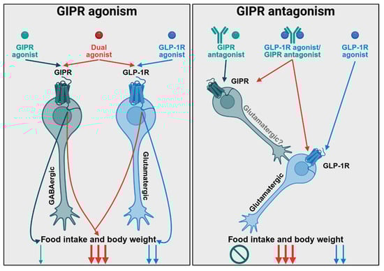 Third, there is compelling evidence that GIPR agonism and antagonism act via different neuronal mechanisms to drive weight loss. While preclinical evidence demonstrates both peptide and antibody GIPR antagonists drive modest weight loss in rodents on their own (<5% in DIO mice) [,], they appear to require combination with GLP-1R agonism to drive greater efficacy (>20% weight loss in DIO mice). The effects of the antagonists require intact action at CNS GIPR neurons [], but not GABAergic populations [], making it likely that these effects are mediated by glutamatergic GIPR+ neurons. Crucially, the neuronal transcriptomic changes induced by peptide GIPR antagonism are significantly different from those of GIPR agonism but closely mirror that of GLP-1R agonism []. Conversely, GIPR agonism alone can drive significant weight loss by acting on CNS GABAergic but not glutamatergic neurons [,,,]. These effects add to, and even synergize with, that of GLP-1R agonism. These data collectively suggest a unified theory in which that GIPR agonism drives efficacy both on its own and in combination with GLP-1R agonism by acting on receptors in GABAergic neurons, while GIPR antagonism in glutamatergic neurons primarily serves to alleviate a brake on GLP-1R action (Figure 1).