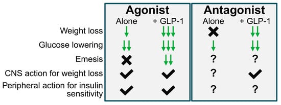 A summary of the actions of GIPR agonists and antagonists with and without GLP-1R agonists in preclinical studies on key outcomes for obesity therapeutics. Downward arrows indicate a reduction in the parameter; 1 arrow indicates a smaller reduction relative to 2. An X indicates no effect of the drug, a check mark indicates an action of the drug, a question mark indicates an unknown quality of the drug.