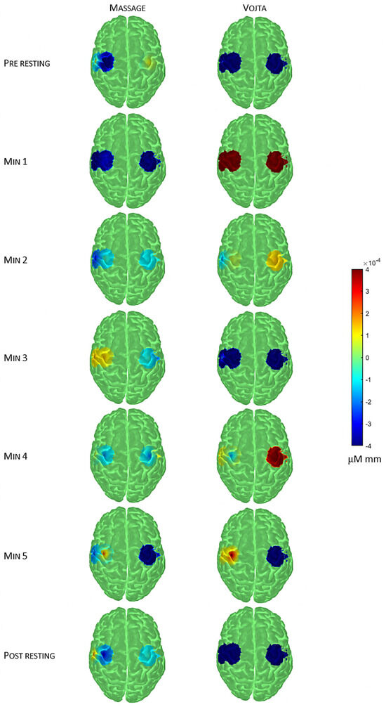 Both subjects only showed similar patterns of HbO concentration during the fifth minute. The Vojta intervention reached a higher level of activation bilaterally during the intervention. The massage intervention, on the contrary, showed higher activation in the left hemisphere during the intervention, which was partly maintained during the post-intervention resting period in the most ventral part, but was always lower than in the Vojta intervention. The HbO patterns of both subjects during the pre-intervention resting period were different, with the massage subject presenting more activation in general and in the right hemisphere locally, contrary to the Vojta subject. Finally, the effect of the intervention with respect to the pre-intervention period was also different for each intervention. The massage subject showed a mild decrease in activation in the right hemisphere and a mild increase in the most ventral area of the left hemisphere. The Vojta subject went back to pre-intervention activation values bilaterally, or even lower.