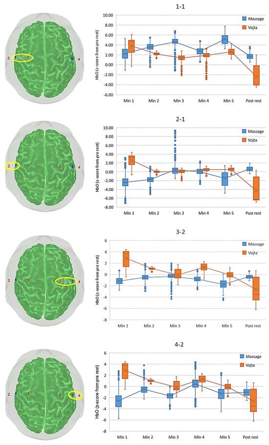 Figure 4 shows how the activation varies with respect to the pre-intervention resting period for each subject and each motor cortical area targeted. For the most rostral left area (1-1 optode), the massage showed an oscillating increase in activation during the intervention. The Vojta intervention, however, showed a u-shape activation with the lower value in the third minute (resting period) and a substantial decrease during the post-intervention period.