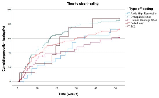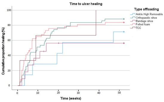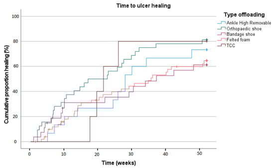 A Kaplan–Meier curve depicting time to healing is shown in Figure 2. Mean time to ulcer healing was 122.2 days (SD 12.8); no statistically significant differences were found between the offloading device groups (p = 0.287).