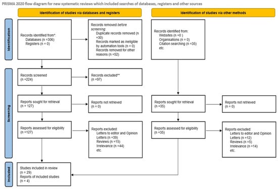 After the first screening, 127 full-text publications were identified and evaluated for eligibility. After full-text screening, 98 articles were excluded. Specifically, 39 reports were letters to the editor or opinion articles that lacked original research data, 15 were review articles that did not present primary study data, and 44 were excluded for being irrelevant, either because they did not assess mitochondrial function in placental tissues or because they failed to report associations with clinical outcomes. In parallel, more studies were discovered through citation searching, generating 35 new records. All of these records were subjected to full-text analysis, and 31 were removed for reasons identical to those used in database searches as 12 were letters or opinion articles, 5 were reviews, and 14 were unrelated to the study question.