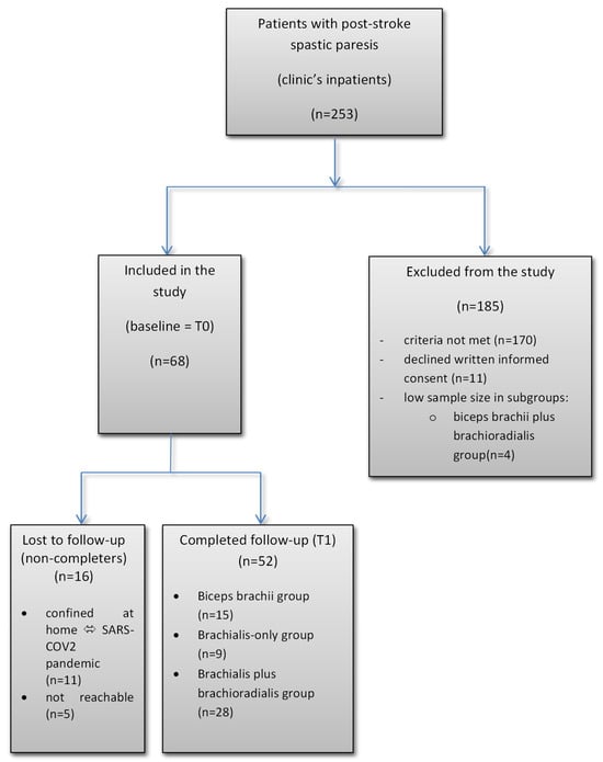 Of the 253 patients screened, 68 were enrolled. A total of 185 were excluded due to not meeting inclusion criteria (n = 170) or declining consent (n = 11). Although we evaluated the three main elbow flexor muscles both individually and in combination, a dedicated brachioradialis-only group could not be established, as clinical assessment revealed no cases in which BoNT-A was indicated exclusively for brachioradialis (n = 0). In nearly all such cases, other elbow flexors also exhibited spasticity requiring treatment. Additionally, a small subset of patients (n = 4) could not be retained due to insufficient representation in the biceps brachii plus brachioradialis group. During the follow-up period, 16 participants were lost to follow-up (non-completers), with 11 confined at home due to the SARS-CoV-2 pandemic [36] and 5 being unreachable. The final analysis included data from 52 participants who completed the study protocol. The fifty-two completers included in the data analyses were divided into three groups according to the elbow flexor muscles injected with BoNT-A: biceps brachii group, brachialis group, and brachialis plus brachioradialis group.