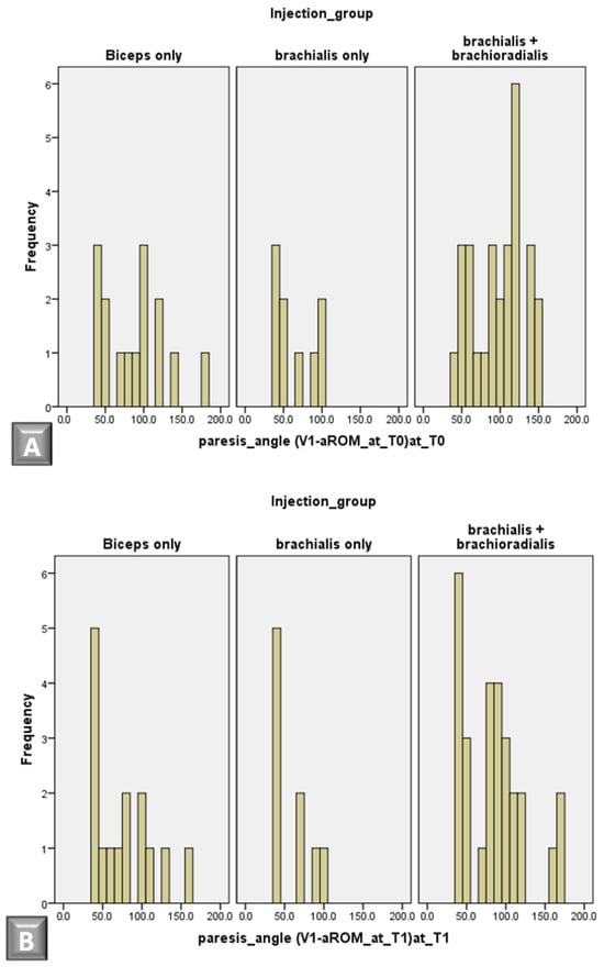 Although within-group improvements were observed, statistically significant between-group differences after Bonferroni correction were limited to a few key variables. A very strong correlation was observed between both the active range of motion and the paresis angle measured at baseline and at follow-up. This finding contrasts with a previous study’s assertion [55] that arm function does not improve. In our study, based on our testing methods, active ROM increases. However, we cannot definitively conclude whether overall elbow functionality improves, which is a limitation of our study. Furthermore, the aforementioned study [55] suggests that there is no difference in outcomes based on which elbow muscles are injected, stating that the Modified Ashworth Scale (MAS) score improves regardless of muscle selection; however, results from the current analysis yielded several important differences regarding muscle selection.