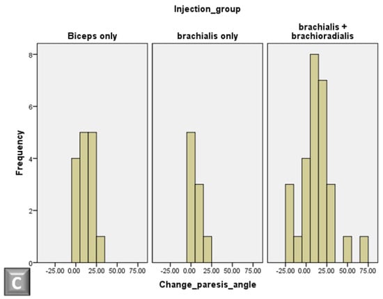 Although no significant inter-group differences were observed in muscle tone (MAS) or spasticity angle (Table 3), Kruskal–Wallis analysis revealed a statistically significant difference in paresis angle across the groups at baseline assessment (p = 0.027) (Table 4). Specifically, the brachialis plus brachioradialis group exhibited the highest paresis angle, followed by the biceps brachii group, and the brachialis-only group demonstrated the lowest paresis angle, as indicated by the mean ranks. Furthermore, a statistically significant difference was found between the brachialis-only group and the brachialis plus brachioradialis group at baseline using the Mann–Whitney U test (p = 0.007). While the Kruskal–Wallis test did not reveal statistically significant inter-group differences in paresis angle at follow-up, the mean ranks suggest that the greatest improvement in paresis angle occurred in the brachialis plus brachioradialis group (mean rank = 28.08), followed by the biceps brachii group (mean rank = 28.00), with the brachialis-only group exhibiting the least improvement (mean rank = 19.06). Thus, despite having the highest paresis angle at baseline, the brachialis plus brachioradialis group also demonstrated the greatest change (improvement) in paresis angle at follow-up. The biceps brachii group exhibited a similar improvement in paresis angle to the brachialis plus brachioradialis group (mean rank = 28.00 vs. 28.08, respectively), but had a lower paresis angle at baseline (mean rank = 25.00 vs. 30.82, respectively). The brachialis-only group appeared to have the least improvement in paresis angle, as evidenced by its low mean rank at follow-up (19.06), despite having the lowest paresis angle at baseline (mean rank = 19.56). Taken together, these findings suggest that the paresis angle diminished and motor control improved most substantially in the brachialis plus brachioradialis group, followed by the biceps brachii group, with the brachialis-only group exhibiting the least improvement (Figure 2).