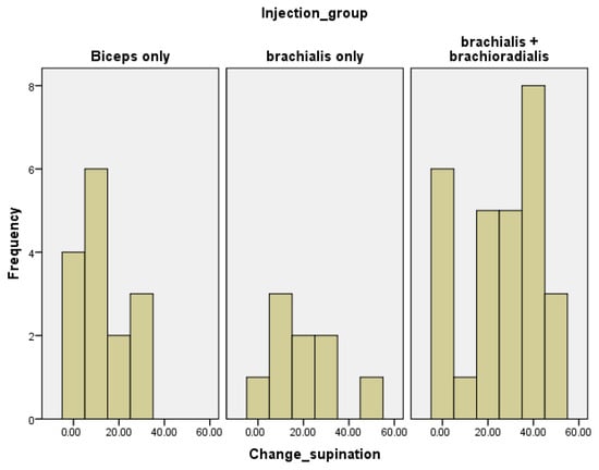 From a biomechanical perspective, the biceps brachii [52,53] may not be as advantageous a target for injection in this context, whereas the brachialis [28] and brachioradialis [53,54] are more favorable, and their combination even more so. This could explain why, overall, the biceps brachii group exhibited less favorable outcomes. The change in spasticity angle was similar for the biceps brachii and brachialis groups (Table 4). However, the BoNT-A dose administered to the biceps brachii group was higher than that administered to the brachialis group (Table 2), suggesting that the brachialis is more efficient at lower BoNT-A doses than the biceps brachii. Had the brachioradialis also been injected in the biceps brachii group, the results might have been better, as observed in the brachialis plus brachioradialis group. However, that group received the highest BoNT-A doses. Therefore, we can infer that a higher BoNT-A dose is associated with greater improvements in spasticity, supination, and pronation.