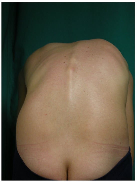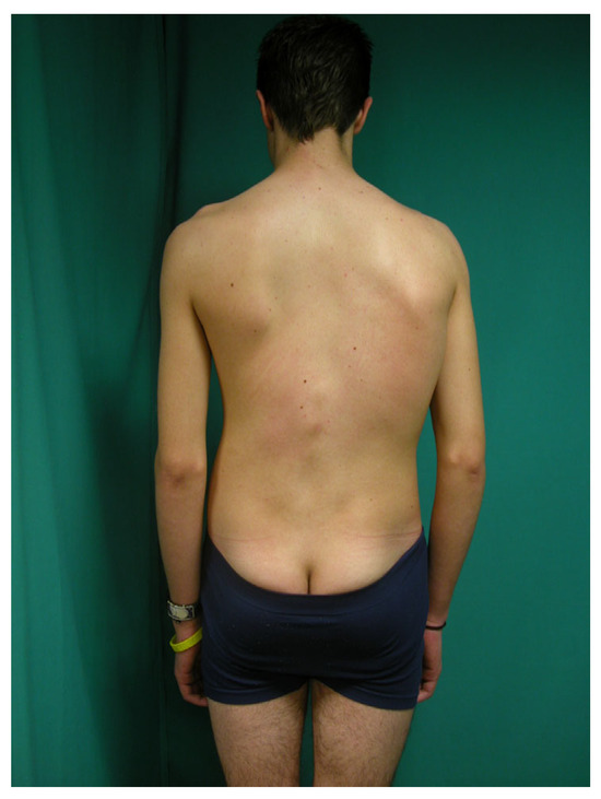 Figure 1. A 14-year-old adolescent with a scoliotic morphotype presenting with right scapular elevation, waist asymmetry, and protrusion of the right scapula and left thoracco lumbar region.