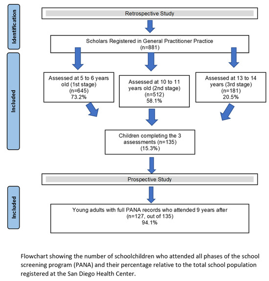 - The initial target population consisted of 881 schoolchildren (both male and female) who were scheduled to participate in all three phases of the PANA health screening program during three years. Figure 3 illustrates the sample distribution and dropout rates across the study timeline.