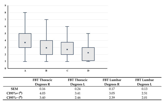 Box-and-whisker plot of measures (in degrees) during FBT at thoracic and lumbar levels in adults after 9 years of the three phases of the screening program, indicating mean, Q1, Q3, and maximum and minimum values. On the vertical axis (ordinate), the distributions of measures in the Adams test are represented (in degrees). On the horizontal axis (abscissa), the four groups are displayed: A = Thoracic Right, B = Thoracic Left, C = Lumbar Right, and D = Lumbar Left. Below, the exact values for the four groups are shown (R = Right; L = Left). SEM = standard error of the mean. CI = confidence interval.