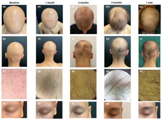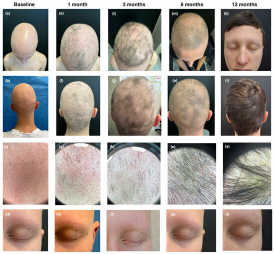 Clinical and trichoscopic presentation at baseline (a–d); after 1 month of therapy with upadacitinib (e–h); after 3 months of therapy with upadacitinib (i–l); after 6 months of therapy with upadacitinib (m–p); and after 12 months of therapy with upadacitinib (q–t).