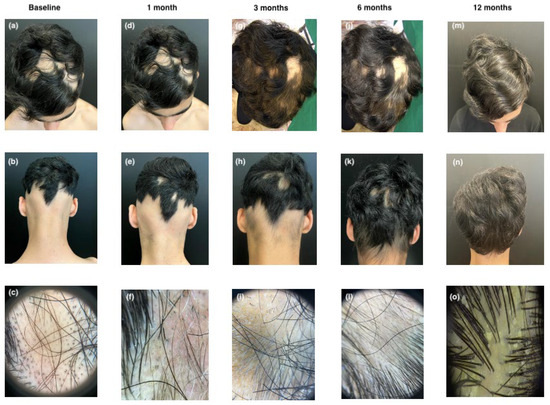 Clinical and trichoscopic presentation at baseline (a–c); after 1 month of therapy with upadacitinib (d–f); after 3 months of therapy with upadacitinib (g–i); after 6 months of therapy with upadacitinib (j–l); and after 12 months of therapy with upadacitinib (m–o).