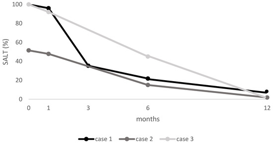 At baseline, Cases 1 and 3 had a SALT score of 100%, while Case 2 had a SALT score of 51.5%. After one month, all cases showed initial improvement. By six months, patients exhibited substantial regrowth (SALT of 21.8, 15, and 45, respectively), with near-complete remission at 12 months (SALT of 14, 1.8, and 0, respectively) (see Figure 4).