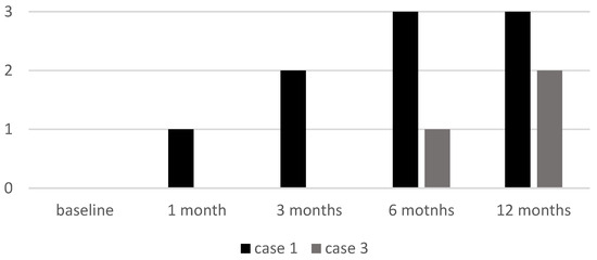 Cases 1 and 3, both with alopecia universalis, had an initial ELA score of 0. Case 1 showed a progressive increase to 3 by six months, while Case 3 remained at 0 until six months, when it reached 1, with further improvement at the 12-month follow-up visit (ELA 2) (see Figure 6).