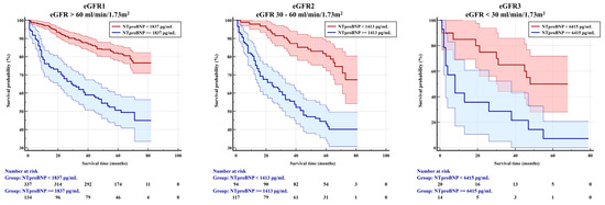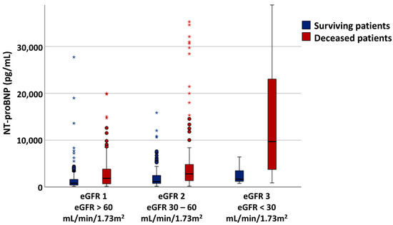 NT-proBNP values increased proportionally with worsening renal function, and within each eGFR category. The surviving patients had significantly lower NT-proBNP values compared to the deceased ones, in each of the evaluated eGFR subgroups (Figure 1, Table 2).