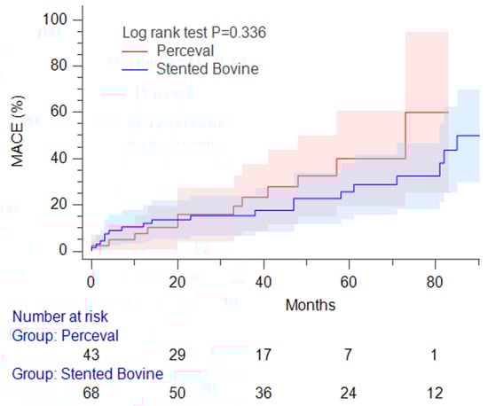 Kaplan–Meier analysis demonstrated no significant difference in the cumulative incidence of major adverse cardiovascular events between the Perceval and conventional valve groups (log-rank test, p = 0.336). The shaded areas represent the 95% confidence intervals for each survival curve.