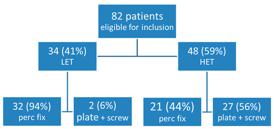 Type of trauma and type of surgery of the patients included in the study. HET, high-energy trauma; LET, low-energy trauma.