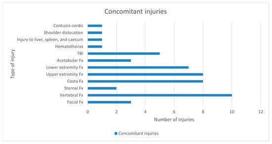 Type and frequency of concomitant injuries. Fx, fractures; TBI, traumatic brain injury.