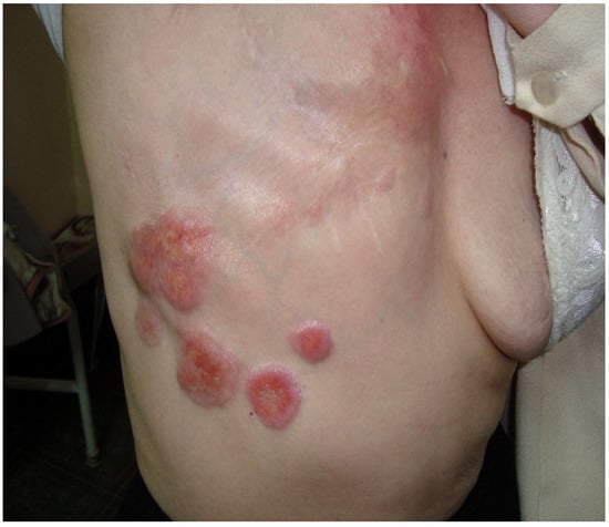 Radiodermatitis is an inflammatory or dystrophic skin process produced by the direct action of ionizing radiation. Stevens, in 1896 [], was the first to report on the appearance of skin lesions caused by X-rays. Later in 1901, Becquerel and Curie observed the appearance of erythema and ulcerations on skin accidentally or voluntarily exposed to radiation. According to various authors, it is accepted that chronic radiodermatitis undergoes an epitheliomatous transformation in 10–34% of cases. Both squamous and basal cell epitheliomas can develop. The latency period is between 4 and 42 years. For squamous cell epitheliomas, the latency period is shorter (3–25 years) than for basal cell epitheliomas (31–35 years) []. In the case of post-therapeutic radiodermatitis, the latency period is shorter than it is in the professional one []. Most of the carcinomas that appear are squamous cell carcinomas, and develop metastases in 20% of cases [].