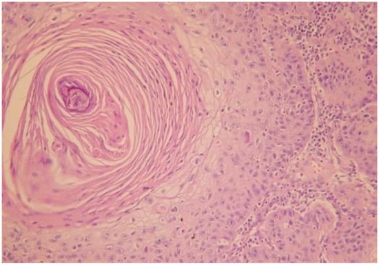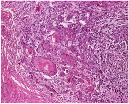 SCC is a type of malignant tumor that develops from the keratinizing cells of the epidermis or its appendages and is the second most prevalent form of skin cancer in immunocompetent white individuals and the most common skin cancer in immunosuppressed organ transplantation recipients worldwide []. This cancer is locally aggressive and can metastasize, primarily with regional lymph nodes and occasionally to distant organs. Clinically, SCC is often presented as a hardened, hyperkeratotic nodule with central ulceration and a keratin mass or as an ulcerated papule, nodule, or plaque without keratinization. Typically, SCC arises in areas of severe sun damage, often among several nearby actinic keratoses (AKs) []. SCC follows the “classic cancer” structure, which includes precursor lesions, tumor progression, and metastasis. The prognosis is determined by tumor-related characteristics such as tumor size, location on the body, depth of invasion into the subcutaneous tissue, perineural involvement, histological differentiation, and the patient’s immune system []. The current consensus on cutaneous SCC is that the cancer is caused by a single transformed cell of the keratinocytic lineage and develops as a result of genetic mutations that provide a selective growth advantage. The most prevalent genetic abnormalities detected in SCC are TP53 gene mutations. Dysregulation of p53 pathways appears to be an early event in the carcinogenesis of SCC [].