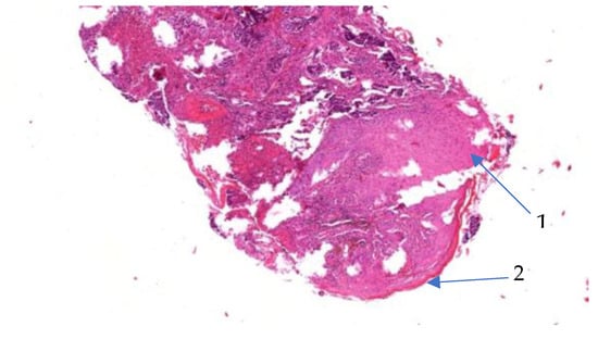 These nodules developed over approximately 5 months, with the first nodule appearing as the largest. In addition to the previously described lesions, a dark red, brick-colored atrophy-scar plaque can be detected on the right parasternal region. From the anamnesis, it appears that the area of this plaque and the area of the largest nodular formation of cc 8 cm in diameter were the areas of radiotherapy application 20 years ago. These two atrophy-scarring areas have persisted for about 15 years, and we can consider them chronic radiodermatitis lesions. No palpable adenopathies were found during the general clinical examination. The laboratory analyses carried out were of no pathological importance. Imaging investigations: lung X-ray, abdominal ultrasound, and computed tomography did not detect distant metastases. Figure 2 presents the histological aspect of squamous cell carcinoma. The histopathological examination performed on the largest tumor lesion confirmed the diagnosis of squamous cell carcinoma, and the one performed on the right parasternal plaque confirmed the diagnosis of chronic radiodermatitis, finding an alternation of epidermal atrophy, hyperacanthosis, and hyperkeratosis. In the dermis were found endovasculitis with dilatations of small vessels, true angiomatous lakes, such as the absence of hair follicles, sebaceous, and sweat glands. The treatment recommended to the patient was surgical.
