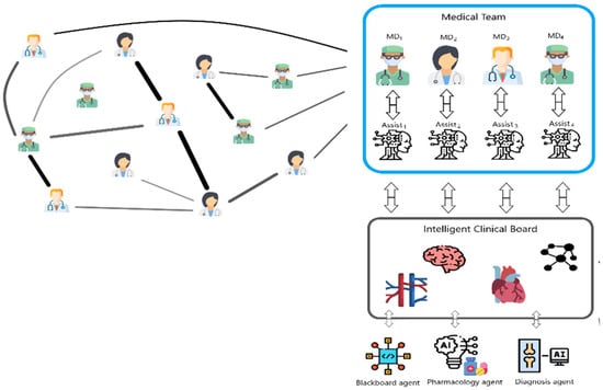 In previous research [], we presented the foundations of a highly complex cooperative reasoning based on an intelligent multi-agent system and a team of physicians. The proposed so-called Intelligent Medical Hybrid System (IntMediSys), which is an agent-based system, supports the cooperation of teams of physicians and provides intelligent decision support. The proposal is designed to solve very difficult medical diagnosis cases. The proposed innovative collaborative reasoning is an extension of the so-called blackboard-based problem solving proposed in the field of artificial intelligence. Earlier studies [,] present the first time the blackboard-based problem solving in AI literature, whose idea originates from the children’s Jigsaw puzzle game, which involves more children who collaboratively construct an image split into parts. Even though it is appropriate for AI-based problem solving for very difficult problems, it has very few implementations due to its emergent high complexity in hybrid problem-solving implementation. Further research [] provides an in-depth study of the cognitive complexity of designing the human group decision process.