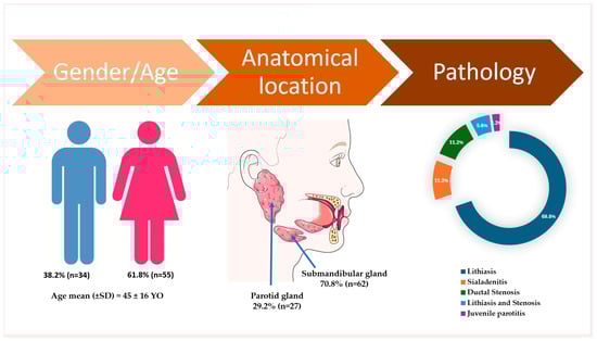 A total of 89 patients were included in this retrospective study. The mean age of the cohort was 45 ± 16 years (range: 14–78 years). Of the total participants, 61.8% were female and 38.2% were male (Figure 1). The follow-up period was between two months and four years, with a mean of 28 months. The stratification by gender and salivary gland involvement (parotid vs. submandibular) is presented in Table 1.