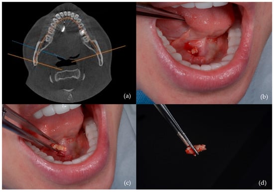 Figure 2. Sialolithotomy of a 9 mm calculus: (a) CBCT axial view showing the radiopaque calculus; (b) intraoperative view; (c) calculus removed from Wharton’s duct; (d) the calculus following sialolithotomy.