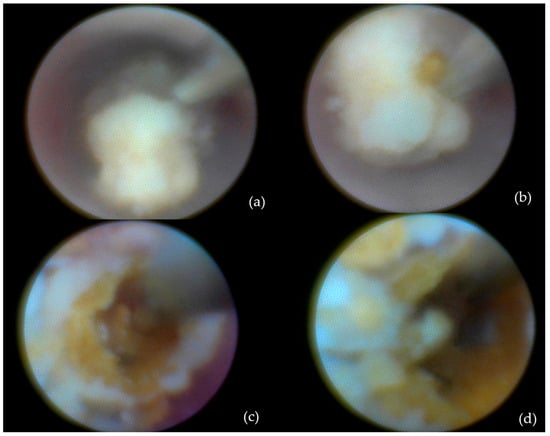Figure 3. Calculus removal by sialolithotripsy—procedural steps: (a) Initial appearance; (b) identification of a longitudinal fissure; (c) appearance after removal of a fragment from the sialolith; (d) fragmentation of the sialolith into two distinct portions.