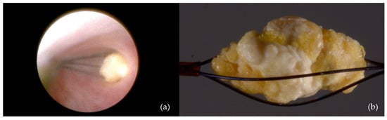 Figure 4. Interventional sialendoscopy using a Dormia basket: (a) Stone captured with the extraction probe; (b) stone secured within the Dormia-type device (macro lens view).