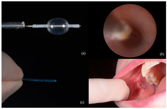 Figure 5. Ductal dilation and stenting: (a) Balloon used for dilation of the stenotic duct segment; (b) progressive ductal expansion; (c) stent used for maintaining ductal patency; (d) stent positioned and secured within Stensen’s duct.